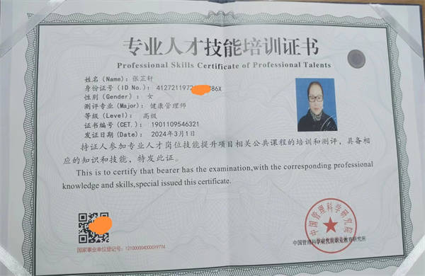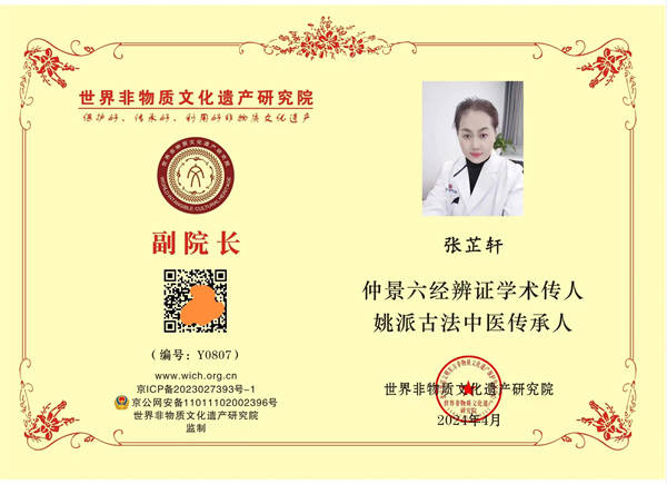 一份荣誉,一份担当 近日,笔者从世界非物质文化遗产研究院获悉,山东孔圣府国医馆专家组组长、华夏人文出版社签约国学研究学者、传统文化创新发展茅山论坛传统医学传播大使、张仲景六经辨证学术传人、当代伤寒大家姚秀玲先生的得意弟子张芷轩女士被世界非物质文化遗产研究院理事会聘为常务理事兼副院长。2024年3月张芷轩(曾用名张惠利)女士荣获中国管理科学研究院职业技术研究所颁发的健康管理师资格。