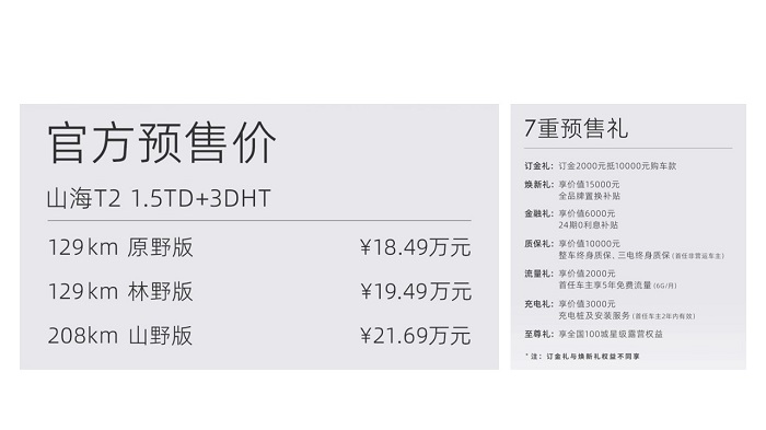 4月2日,捷途汽车宣布,定位为“旅行越野超混SUV”的山海T2正式开启预售。新车共计将推出3款不同配置车型,预售价格区间为18.49万-21.69万元。同时,预售期间捷途官方还将为用户推出7重预售礼。