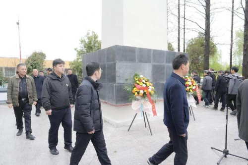 镇党委书记沙进军,党委副书记、镇长赵纬斌上前整理花篮挽联,表达对烈士的无尽哀思与崇高敬意。