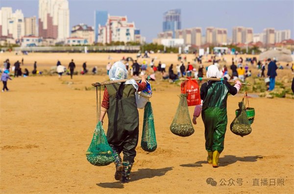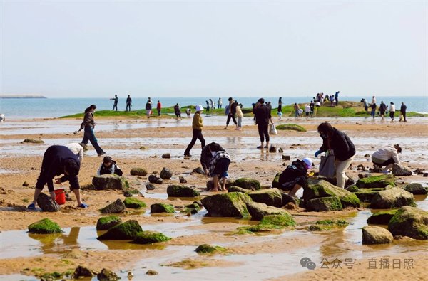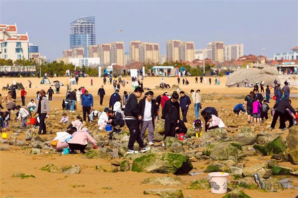 在这个春日里 人们穿着轻便的衣服 提着小桶、拿着小铲子 兴奋地寻找着 各种贝壳、海螺等海产品
