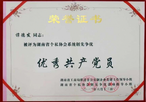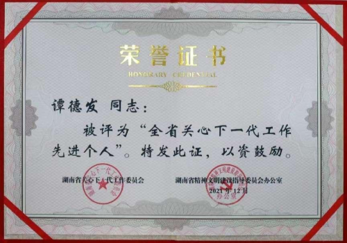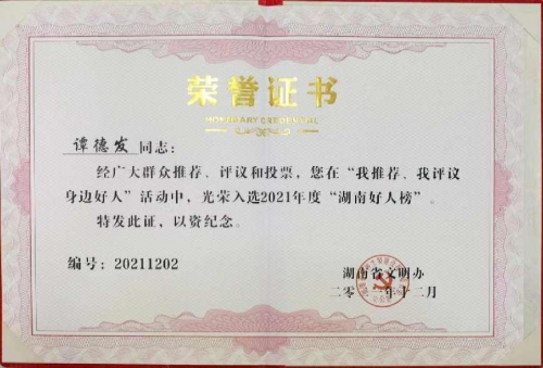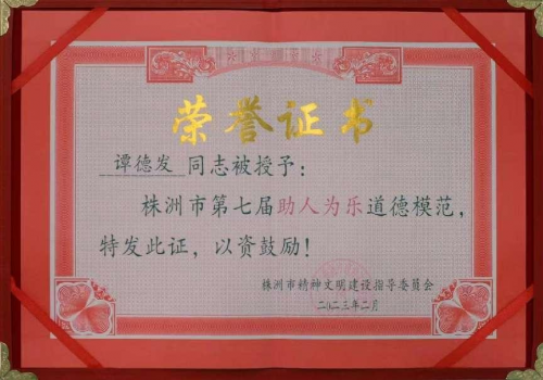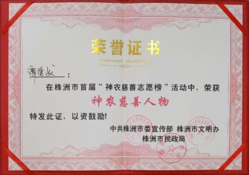 各级政府和组织也先后授予他各项荣誉:2000年12月被省政府授予湖南省双拥先进个人;2012年6月被评为2012年度湖南省创先争优优秀共产党员;2012年12月被评为湖南省诚信经营先进个体工商户;2013年度荣获株洲市“学雷锋优秀志愿者、“志愿助残先进个人”;2019年12月荣获2019年度株洲市首届最美退役军人;2021年12月评为湖南省关习下一代工作先进个人,同时光荣入选2021年度湖南好人榜;2022年被授予“株洲市道德模范”、“株洲市最美拥军模范”;2022年8月被解放军73146部队授予“退役不褪色、拥军当模范”荣誉称号;2023年3月获评株洲市“十大神农慈善人物”。2023年9月受邀出席在海南博鳌论坛举行的第二十三届世纪大采风品牌人物盛典,被授予2023年度公益慈善品牌人物荣誉称号。2023年11月被株洲市关工委授予第三届“最美五老”荣誉称号;2023年获评“株洲市文明家庭”。 |
