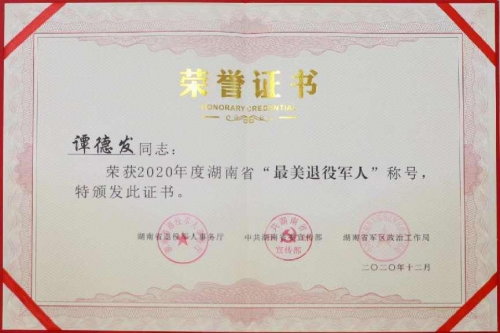 作为退役军人,谭德发对部队有着深厚的感情,对老兵群体有一种特殊的感情。多年来,谭德发在一直帮助生活困难的退伍战友,为他们捐款捐物并提供就业岗位,帮助他们在各自的岗位上发光发热,贡献退役军人的力量。炎陵县鹿原镇退伍军人潘春生曾经家庭生活十分困难,谭德发把他安排在自己在县城的企业上班,不仅帮助其家庭摆脱了贫困,而且两个儿子还可以在教学条件更好的县城学校上学,后来他们不负众望先后考取了名牌大学,大学毕业后分别在空军部队和国家电网工作。2022年,谭德发自掏腰包成立县关心关爱退役军人基金会,同时出资20多万元购买炎陵黄桃慰问部队官兵以及市、县一线防疫人员,向他们致以最崇高的敬意。