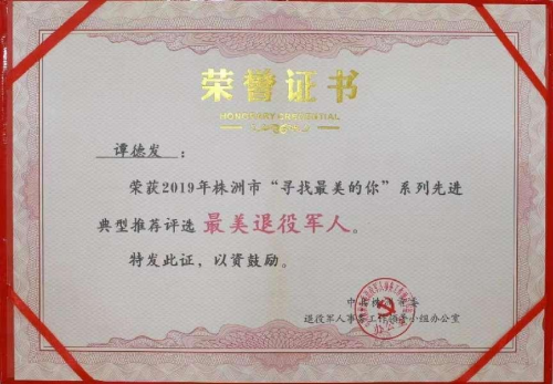 一、退役不褪色,扬帆再起航 谭德发,1955年出生,中共党员,湖南省炎陵县人,德发集团公司负责人,炎陵县个私协会会长。1978谭德发退役回乡,先后在炎陵钨矿、县民政局工作。在部队,他是一名优秀的士兵,屡获嘉奖,曾获“四学运动”先进个人;退伍后,他不褪军人本色,勇于创新创业,乐于扶贫助困,坚持做公益事业,一边实现自己的创业梦,一边帮助他人圆梦。