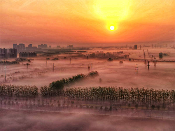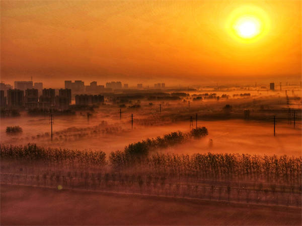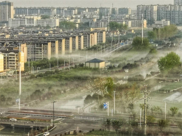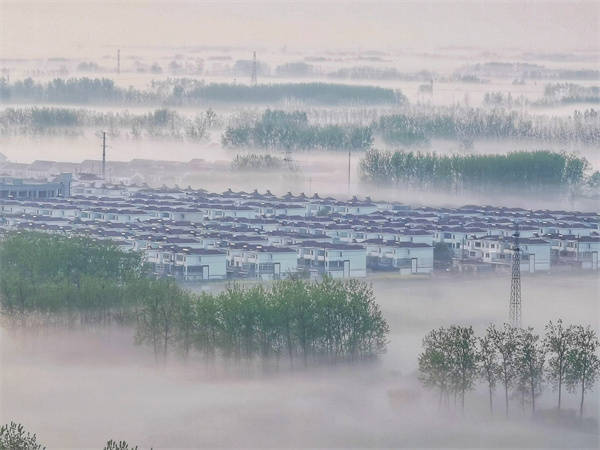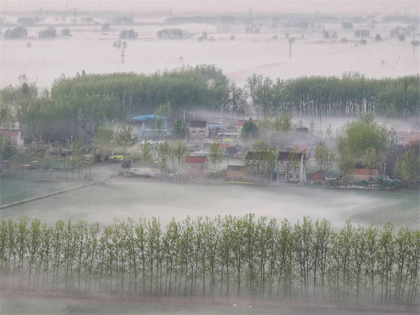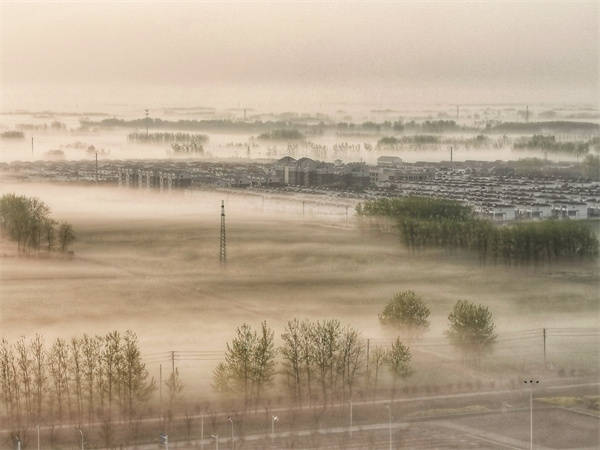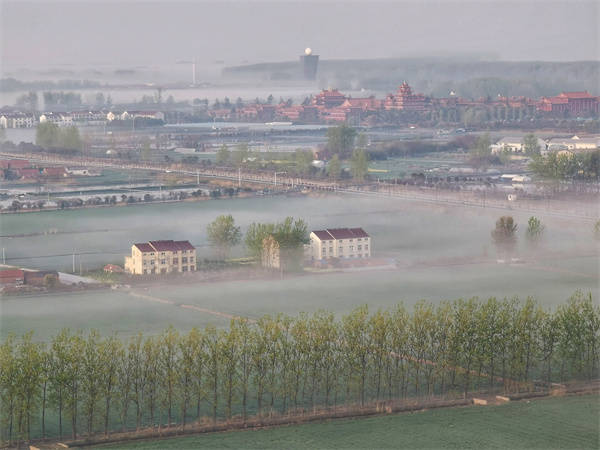 4月9日晨,江苏省淮安市洪泽区惊现平流雾奇观 城乡云雾缭绕若隐若现如人间仙境,乡村在薄雾中如梦如幻,淡淡的雾气就像是一幅巨大的白色绸缎,轻轻地覆盖在春色的田野上,为这片宁静的湖畔城区乡村增添了一份神秘而唯美的色彩。(桂宝林 蔡群摄)