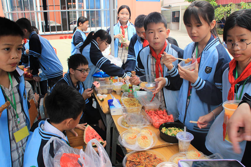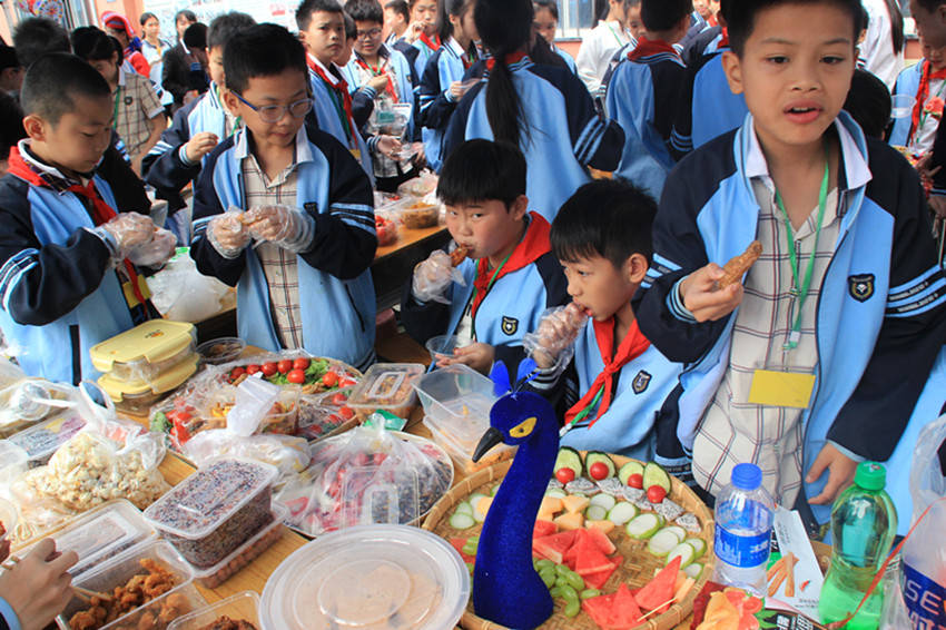 而在美食区,孩子们亲手制作的各种特色美食更是琳琅满目。香气扑鼻的五色糯米饭、撩起儿时记忆的艾叶糍粑、口感独特的壮乡酸野,以及精致的清明粽子,以及各种各样的特色点心和清凉饮品。这些美食不仅让孩子们大饱口福,增进了他们对广西不同地区饮食文化的了解,同时也培养了他们的团队合作精神和实践能力。