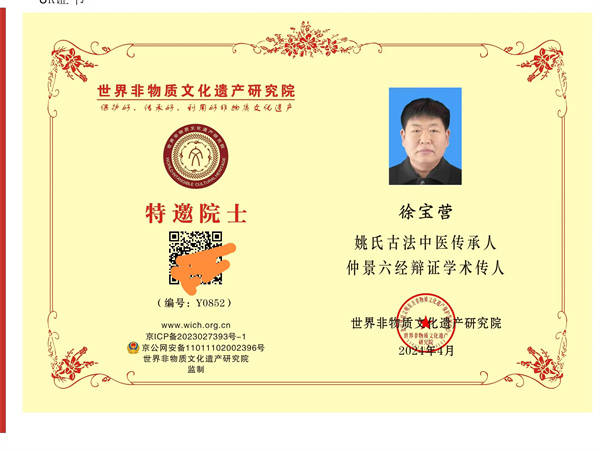 近日,笔者从世界非物质文化遗产研究院院委会获悉,新时代传统名医名家、中关村炎黄中医药科技创新联盟姚氏古法中医传承委员会秘书长、河南省乡村振兴协会医疗帮扶委员会核心专家组成员、姚氏古法中医传承人徐宝营先生经过世界非物质文化遗产研究院的专家学术评审,被研究院授予“特邀院士”殊荣。这是世界非物质文化遗产研究院对姚氏古法中医传承的高度认可,对其为弘扬中医药文化、增强新时代文化自信的高度肯定。