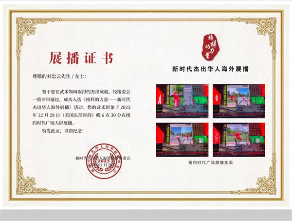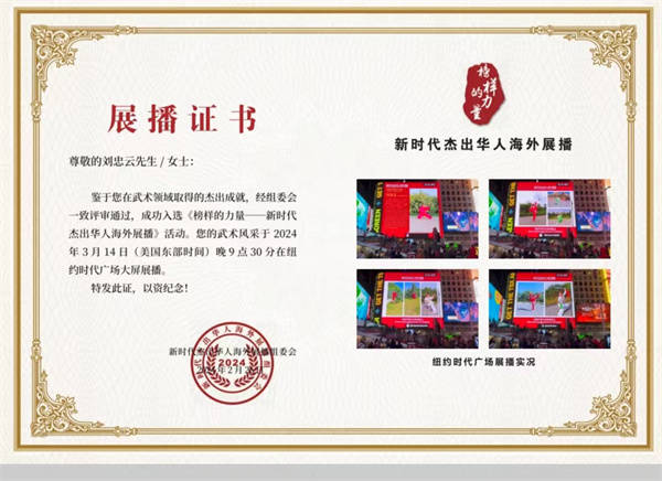 在和春景明,美丽如画,繁花似锦、绚烂多彩,尽享美丽春光的视觉盛宴中,我又迎来了一个非常值得特别庆贺的武术好消息。山西省大同市“子母绵掌”研究会副会长,“子母绵掌”代表性传承人,“子母绵掌”第四代传承人,中国平型关女侠刘忠云的武术造型功夫照片,武术形象第二次受北京(炎黄九州)文化艺术交流中心邀请参加(新时代榜样的力量——杰出华人海外展播)活动。 捷报频传,振奋人心,好消息犹如温暖的阳光,照亮人心,让人感到愉悦与欢喜,让人忍不住想要与她人分享。刘忠云的武术风采于2024年3月14日(美国东部时间)晚9点30分第二次在纽约时代广场大屏展播。刘忠云的武术造型功夫照片又同样受到了许多武术爱好者的喜欢,呼声仍然极高。