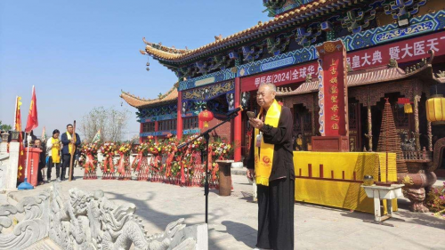 图为长治军分区原副司令员刘海靖发表讲话 长治军分区原副司令员刘海靖在讲话中说, 受甲辰年(2024)全球华人恭祭娲皇大典暨大医天下中医药文化寻根探源工程刘隼总指挥委托,并代表山西省军区原副政委谢玉久少将,首先对公祭大典暨启动仪式表示热烈祝贺!