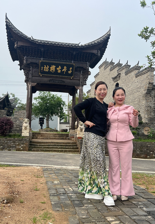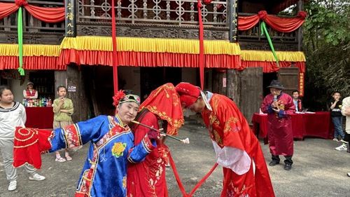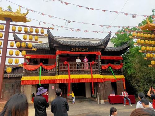 随后又到乡喜楼看王婆说媒现场招亲。乡喜楼上,“抛绣球招婿”匾额高挂;楼前小广场,人山人海,热浪高涨。我们没有想到的是,王婆由余红梅董事长扮演,自号“余干姐”,她亲切自然的新洲普通话十分接地气,不时引起楼下观众的一阵阵掌声。 人人都说脱单难,舍近求远跑河南。 月老自有余干姐,凤娃古寨结良缘。
