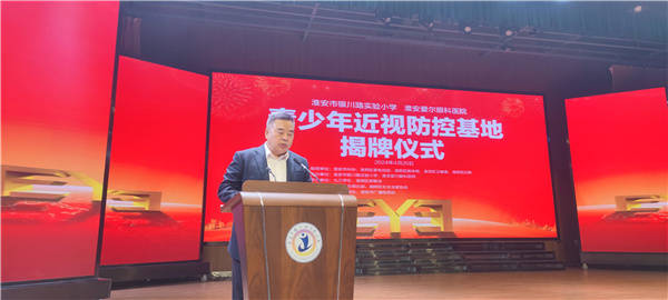 淮安市科协秘书长、四级调研员吴长青,淮阴区统战部常务副部长包政之,淮阴区教体局副局长朱卫民,淮阴区卫健委党委委员谷士春,淮阴区妇联副主席王亚红,铁军老兵俱乐部全国总部长吴海斌,淮阴区新联会会长周淮英,淮阴区女企业家协会会长曹睿,淮阴区银川路实验小学校长蒋文和,淮安爱尔眼科医院CEO曹勇胜,“中国好人”金驹、淮安爱尔眼科医院视光中心主任邓华等出席了本次活动。 银川路小学副校长周健飞在致辞中感谢市科协、区委统战部、区教育局、区卫健委、区妇联等部门对于活动的支持和指导,感谢淮安爱尔眼科医院的责任与担当,希望医校携手,以“青少年近视防控基地”揭牌为契机,构建政府、学校、家庭、社会、医疗机构五方协作平台,共同呵护少年儿童健康成长。 揭牌仪式上,淮阴区委统战部常务副部长包政之对近视防控科普工作做了指示。他指出:眼健康是国民健康的重要组成部分,青少年近视防控关乎祖国的未来,事关每一个家庭、每一个孩子的健康成长,也是学校、家庭、社会的共同责任。希望爱尔眼科医院与学校紧密合作,共同制定近视防控计划,开展青少年视力筛查、近视防控科普讲座等一系列措施,帮助儿童青少年树立近视防控第一责任人的意识,共同做好儿童青少年视力全周期管理,有效降低、控制青少年近视率。 随后,淮阴区教体局副局长朱卫民对“青少年近视防控基地”的成立揭牌表示热烈的祝贺。他表示,孩子们的健康是第一位的,希望通过建立青少年近视联合防控,让同学们对如何科学保护视力有一定的认识,在日后的学习和生活中能更好爱护自己的心灵之窗,让孩子们都能拥有一双明亮的眼睛。 淮阴区卫健委党委委员谷士春在讲话中指出,青少年是祖国的未来,“青少年近视防控基地”的设立是关乎青少年健康成长的重要举措。接下来,淮阴区卫健委将聚焦青少年近视防控工作持续发力,加大对近视防控知识的宣传力度,充分利用“青少年近视防控基地”的专业优势和资源优势,对近视进行早期发现、预防和控制,同时也希望爱尔眼科医院切实发挥其专业优势,建立起科学高效的医校合作机制,让更多青少年能够更好的放眼看世界,快乐、健康成长。 新联会副会长、淮安爱尔眼科医院CEO曹勇胜表示:非常荣幸能够携手淮安市银川路实验小学,共同设立“青少年近视防控基地”,对于医院而言,这是非常好的尝试与开端。爱尔眼科医院集团是中国及全球范围医院规模和医疗能力优秀的眼科医疗集团,专注于眼科学、视觉科学以及各亚专科前沿和临床应用技术的研究和创新。同时,他强调青少年近视防控是一项长期而艰巨的任务,青少年近视“防护墙”需要社会各界共同携手、合力共筑!