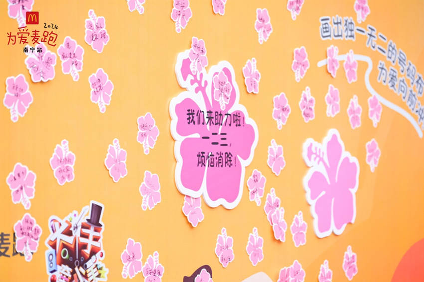 从婴幼儿期“跑”到小学 “为爱麦跑”凝聚社区邻里 南宁站“为爱麦跑”活动设置了亲子跑和嘉年华两项活动,在麦当劳经典人物“四小福”欢乐巡游中暖场启动。在互动花墙区域,小朋友和家长们在南宁市朱瑾花形状的卡片上填写爱心寄语,将祝福寄送给麦当劳叔叔之家的孩子们,用美好祝愿联结彼此;欢乐热身操过后,孩子们在家长陪伴下完成亲子长跑,站上“麦跑小冠军”领奖台。对于很多小朋友来说,这是他们人生的第一个长跑。跑步过后,小朋友和家长们来到“为爱麦跑”嘉年华区域,在一系列互动游戏中度过亲子时光。