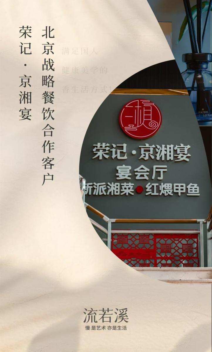 在这个快节奏的时代,人们往往在喧嚣中寻找一片宁静,在繁忙中渴望一丝雅致。正是这份对美好生活的向往,催生了无数创新与变革。“流若溪”——这一源自“姬熙(上海)化妆品有限公司”的诗意品牌,凭借其独特的品牌哲学与卓越的产品品质,成功开创了餐饮渠道销售的新模式,为餐饮行业注入了一股清新脱俗的香气。 流若溪:嗅觉记忆的探索者 “流若溪”,一个名字便足以勾起无限遐想的品牌,它不仅仅是一个香薰品牌,更是一种生活态度的倡导者。秉持着“慢,是艺术,亦是生活”的哲学理念,“流若溪”致力于探索那些能够触动人心、唤醒记忆的神秘嗅觉体验。从产品的包装设计到香气的精心调配,每一步都凝聚了对美学和艺术的极致追求,让每一次与“流若溪”的相遇,都成为一场感官与灵魂的深刻邂逅。 餐饮新渠道,香薰新体验 2024年08月15日,“流若溪”香薰正式入驻北京荣记·京湘宴,这一举措不仅标志着“流若溪”在销售渠道上的重大突破,更是餐饮行业与香薰文化深度融合的一次勇敢尝试。在荣记·京湘宴的豪华宴会厅内,“流若溪”香薰以其独特的魅力,为宾客们营造了一个既高雅又舒适的用餐环境,让每一次聚餐都成为一次难忘的嗅觉盛宴。