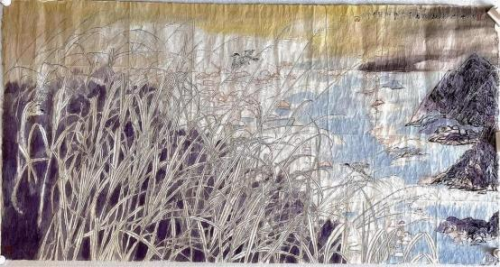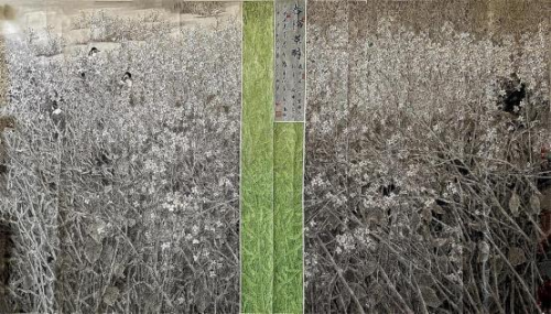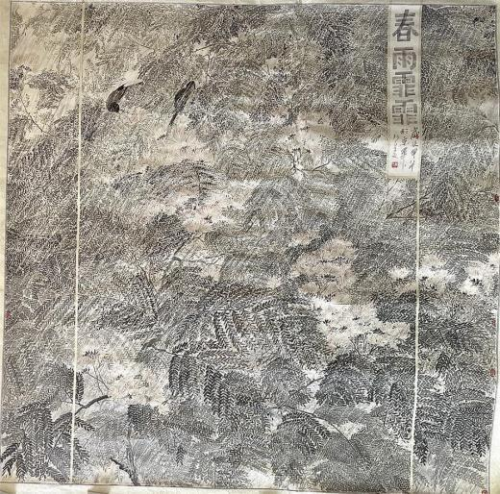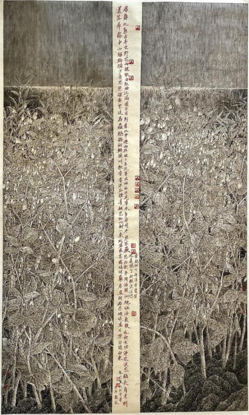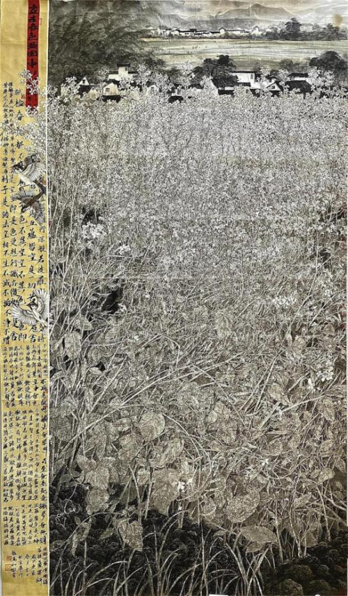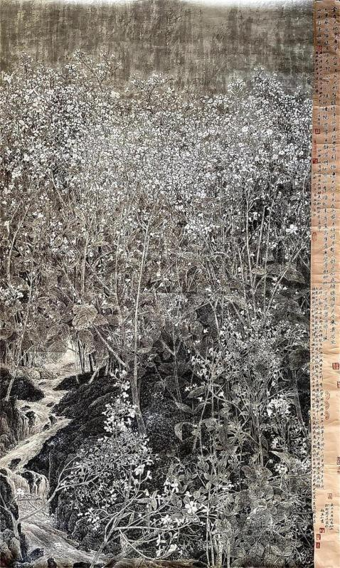 细察作品,不难发现,龙万和作品依然遵循着宋代花鸟画的经验理念, 线的运用,极为精致与富于节奏、韵律变化,叶片、花萼等的勾勒都极 为韵致,可谓大处着眼小处用心,因而枝繁叶茂花香的花鸟作品,充满 勃勃生机,让人体味到生命的活力与生动的生命形式的动人魅力;在“三 矾九染”,“工而不工”,“工写有度” 中,画家运用了平面空间的表现手法, 以枝条的疏密、长短的组合,分割着空间,使看似无序的景象,实是在 按一定结构排列、编码,达到有序的展示。