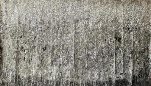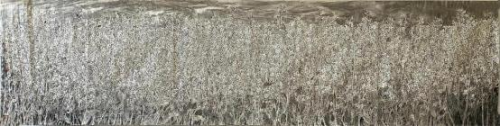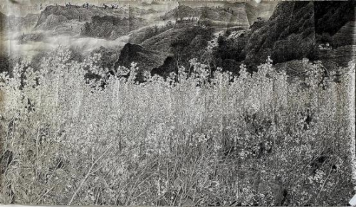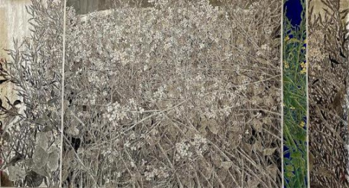 画家善于以构成关系的原理,结构复杂的画面,常常以黑反衬枝、叶、 花,使之在无中心,亦无边缘的平面空间关系中获得“共享”式的美感, 作品的外在气象与内在神韵在有限的空间中获得统一,使作品充实丰满, 洋溢着生命的元气。 可以看出,龙万和在艺术创作中,凭借的是自己对大自然的感觉,笔下 展示的同样也是富有“感觉意味” 的万物繁茂的生命形态与景象。而“感觉” 的独特属性是,不具有还原真实的特点,它是一种介于“似与不似之间” 的具象表现,其中的“ 写意”成分,则深隐在“具象” 的花朵背后,在这里, 可见与不可见、显与隐、有形与无形、确定与不确定的共同作用,使画 面顿生活力。如《春韵》、《山花烂漫》、《霜月》、《蝶飞花》、 《清 风万里香》、《蔗林深深》、《晨韵》等都是这样的作品。