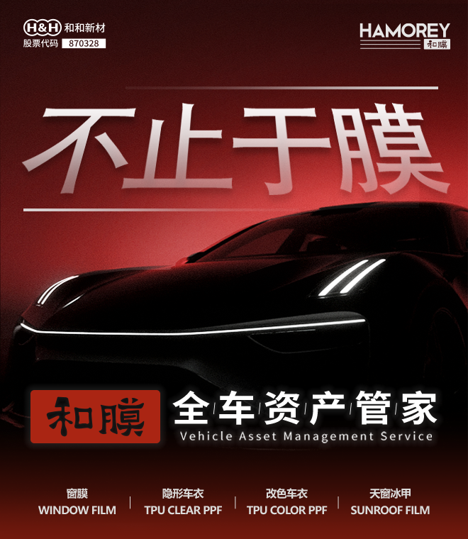 关于和膜 和膜是安徽和和新材料有限公司旗下的高端汽车膜品牌,以 “全车资产管家” 为核心品牌理念,致力于通过材料科学、智能系统与生态服务的融合创新,为车主提供车辆全生命周期价值守护解决方案。品牌秉承 “共你我,和天下” 的共创精神,携手合作伙伴共建健康、可持续的行业生态。