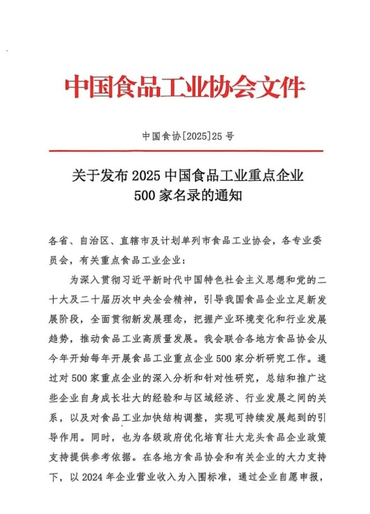 近日,2025中国食品工业重点企业500家名录发布,华英农业荣耀上榜!
