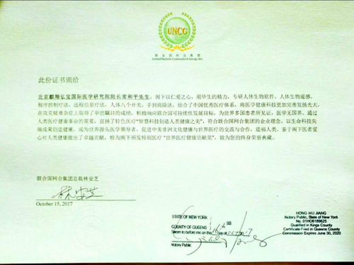 常和平:北京麒翔弘宝国际医学研究院院长,重庆麒翔科技发展公司董事长,中国特医科学院院长,中国健康产业工作委员会副主任,中国管理科学院高级研究员,国际自然医学博士,国际自然医学联盟副主席,世界健康组织联盟副主席。