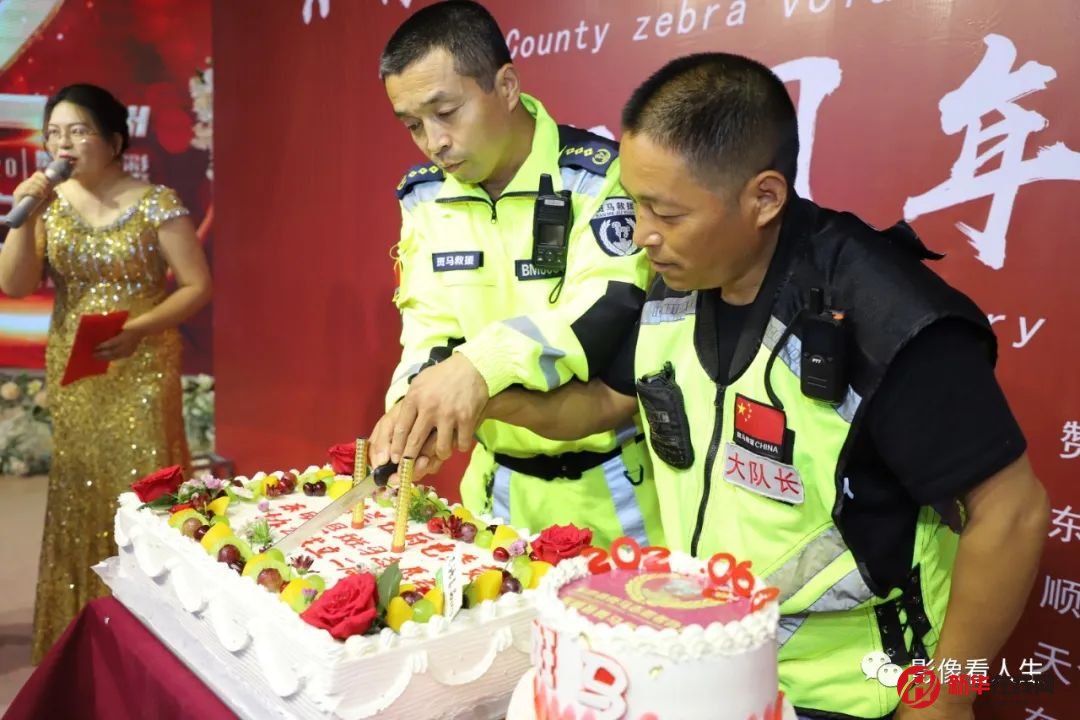 王防震总指挥、王雨增队长共同为 写有“斑马二周岁”的生日蛋糕 点燃生日蜡烛并将其切开 祝愿东明县斑马志愿者协会 不断发展壮大 努力为东明的爱心公益事业做出 新的、更大的贡献