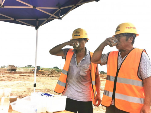 二分部在工地上搭建了多处“移动凉亭”,容纳施工人员临时轮换休息;贴心地为员工们发放了自制的防暑降温常识小卡片,从预防中暑、中暑的表现、中暑救治措施等方面列举了注意事项,方便大家随身携带,增强自我保护意识;为职工配备应急小药箱,购买藿香正气水、风油精、清凉油、湿纸巾、葡萄糖液等防暑药品及用品,方便大家随时取用减轻了施工人员的疲劳和酷暑。综合办公室还每天在午后熬好绿豆汤、凉茶、龟苓膏,并冰镇好派送到施工现场供大家饮用。