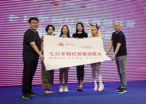七只羊服饰集团总经理贾正宇和四美坊文化产业集体董事长高楚城,为本次训练营的网红代表授旗。 发布会上,网红学员代表和服装模特还为大家带来了精彩的节目演出和七只羊新款服装T台秀。