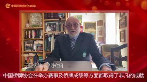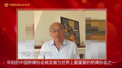 中国桥牌协会协会成立40周年主题口号 中国桥牌协会主席刘晓江以视频形式致辞。他在致辞中说到,40年来,中国桥牌协会加强自身建设,始终以人为本,与各级桥牌组织携手为桥牌运动的发展构建日益健全的保障体系;中国桥牌界始终牢记初心,坚持为社会主义精神文明建设服务;中国桥牌界始终使命在肩,坚持改革创新,为建设体育强国和健康中国贡献力量;中国桥牌界以为国争光为己任,以牌为桥,向世界展示中华风采。未来中国桥牌协会将走解放思想的创新之路、面向市场的产业之路、连通世界的开放之路,引领中国桥牌紧跟时代步伐,脚踏奋进之路,书写新的辉煌。 除中国桥牌协会位于北京的主会场外,全国还设有9个分会场,既有浙江、宁波、太仓等省市桥协,也有北京海淀区桥牌协会这样的基层组织,还有锦烁、普得A类俱乐部以及天津师范大学、深圳职业技术学院等高校,上海圣醒桥牌俱乐部作为培训机构代表也设立了分会场。在现场连线中,各分会场为中国桥牌协会成立40周年送来祝福,并介绍了所在地区、单位的桥牌发展情况及取得成绩,大家纷纷表示未来还将一如既往支持中国桥牌运动,为提高中国桥牌竞技水平,推动中国桥牌更好发展贡献力量。
