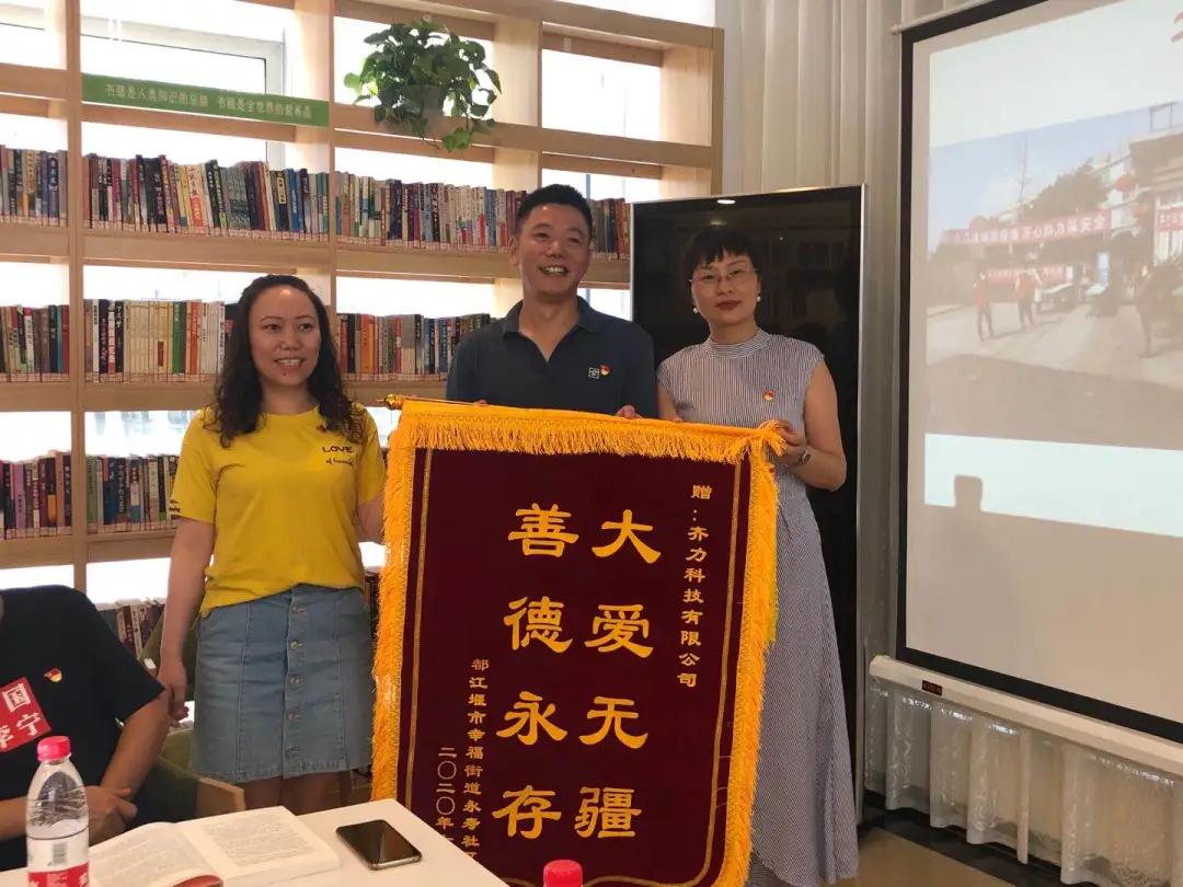 很多的防疫单位和社会组织也参与其中,他们是一群富有爱心的个人和企业家组成的协会,在需要关爱的地方总有他们的身影,他们是都江堰市爱心义工协会,爱心义工协会宋群书同志现场为我们做分享。 为企业赠旗 齐力科技在活动中得到了一份小惊喜:为感谢齐力科技在防疫期间免费为永寿社区提供的各类消毒、防疫物资,永寿社区的党员代表为齐力科技送来了锦旗。