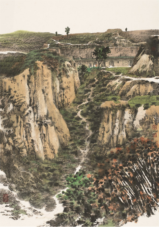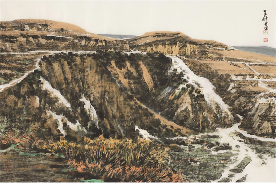 在李呈修独特艺术手法中,于山水皴法之拓新尤为重要。笔墨皴法长久以来被视为中国山水绘画的要义之一,乃至在皴法发展的历程上甚至可以成为映射中国山水画的整体进程缩影之一。李呈修在深入研习与继承中国绘画要义的基础上,从传统中挖掘出这种鲜被运用的表现手法,并加以拓新实践,创新为全新的皴法手法。譬如他大胆地于湿墨渲染中使用干墨皴擦,层次鲜明的架构、深厚的艺术功底与创新的艺术观念,保证了李呈修可以在这种浓淡干湿的韵律中完美地控制、渲染与皴擦。这种崭新的山水肌理效果尤其适合表现厚土高原的现实景致,这或许就是李呈修创作实景自然的重要绘画语言。