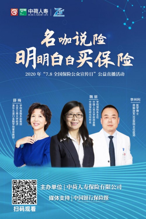 2020年的中荷人寿“78 全国保险公众宣传日”系列活动已经启动。“78 全国保险公众宣传日”活动自2013年创办以来,中荷人寿始终坚持向公众普及专业保险知识、给消费者提供“更轻松”的保险服务的原则,每年积极开展丰富多样的保险宣传活动,用7年的时间,将“78 全国保险公众宣传日”打造成为中荷人寿和保险消费者之间的沟通桥梁。 围绕今年“同心同行,我们在一起”的活动主题,中荷人寿精心策划,将宣传日活动更多地放在线上,采用微信互动、直播、抖音和短视频等多种多样的新媒体科技手段,使2020年的“78 全国保险公众宣传日”活动更加丰富多样、与时俱进。 在今年中荷人寿“78 全国保险公众宣传日”系列活动中,为了向社会公众传递更专业、更实用的保险知识,中荷人寿联合中国银行保险报共同举办“名咖说险”公益直播讲座活动,特邀保险行业内重量级的嘉宾和学者,采取线上直播的方式,在6 月底启动,每周六的14:00相约“名咖说险”直播间,届时,权威学者将以面对面的方式带来三场精彩的公益直播讲座。 专题一:《普通消费者应该怎么购买保险》(6月27日14:00) 此次讲座特邀中国人民大学财政金融学院保险系主任、博士生导师,中国保险研究所所长魏丽博士,为大家重点讲解普通消费者及家庭为什么需要保险以及如何挑选适合自己的保险,为对保险行业认知不够深的消费者带来切身相关的保险知识普及。 专题二:《不得不买的重疾险》(7月4日14:00) 第二场讲座特邀原解放军309医院主任医师,国内知名泌尿外科及肾移植专家,医学博士李州利先生,从多年的诊疗经验出发,为大家讲解什么是重疾,以及购买重疾险的必要性和重要性,购买重疾险的注意事项等相关内容,真正了解重疾与重疾险。 专题三:《保险在家庭资产配置中的作用》(7月11日14:00) 第三场公益讲座将重点讲解保险的经济意义,合理规划保险是防范自身风险和实现家庭经济良性运转的合理有效方式,特邀专家是清华五道口金融学院财富管理项目客座教授、北京工商大学经济学院金融系副教授薛梅博士。 资深大咖专业讲解,内容涵盖保险、健康医学以及经济学方面的专业知识,主题鲜明、干货满满、通俗易懂。相信通过以上三个方面的专业讲解,“名咖说险”可以帮助消费者们更加明白保险对于自身以及家庭的重要意义。 此次“名咖说险”公益讲座,通过直播平台在线直播,全程免费观看,由中国银行保险报为此次活动提供全程媒体支持。大家可以通过扫描海报二维码,凭“202078”邀请码观看中荷人寿此次“名咖说险”公益直播讲座,了解更专业、更实用的保险知识。未来,中荷人寿也将通过形式多样的主题活动,不断普及保险知识、倾听公众心声、提升服务品质,让更多消费者体验“更轻松”的保险服务。