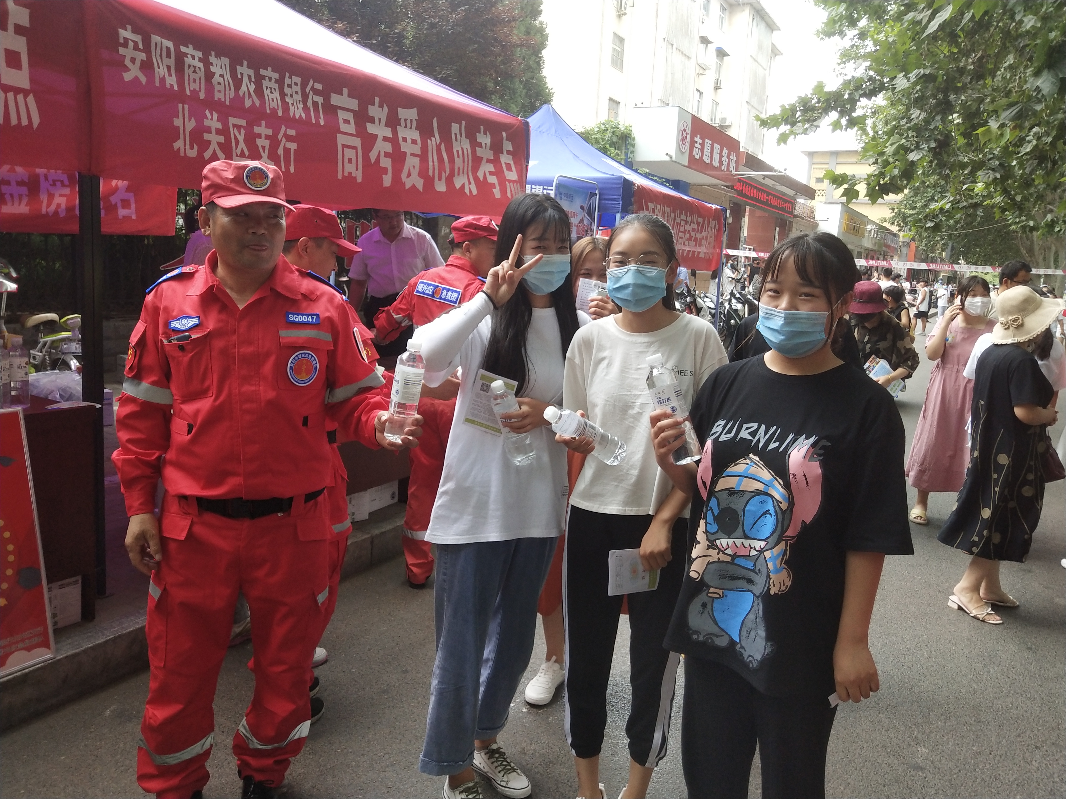 以及安阳市曙光应急救援队以刘继军和李全利为队长的爱心人士为考生提供了防暑降温的矿泉水和防疫口罩,为他们点赞。