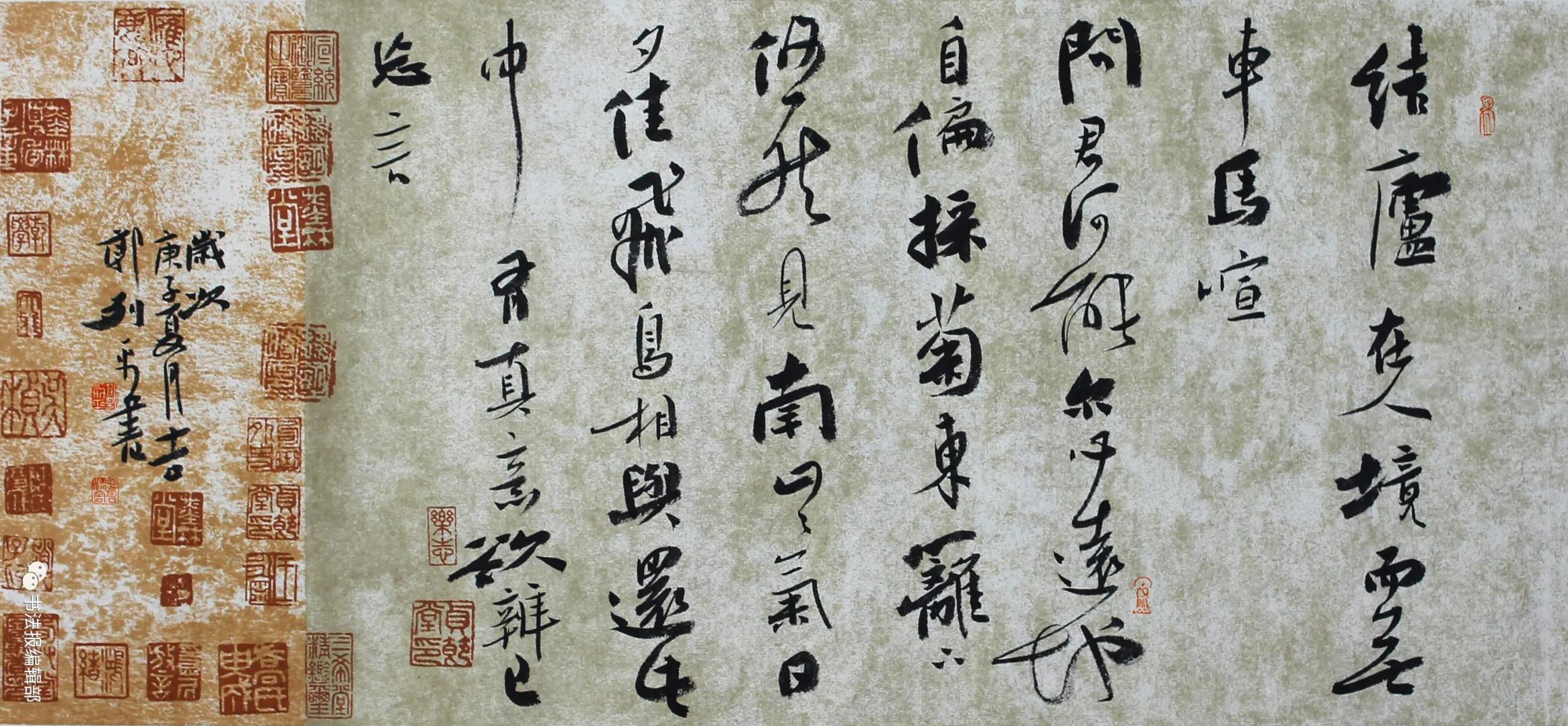 行草横幅 结庐在人境,而无车马喧。问君何能尔?心远地自偏。采菊东篱下,悠然见南山。山气日夕佳,飞鸟相与还。此中有真意,欲辨已忘言。