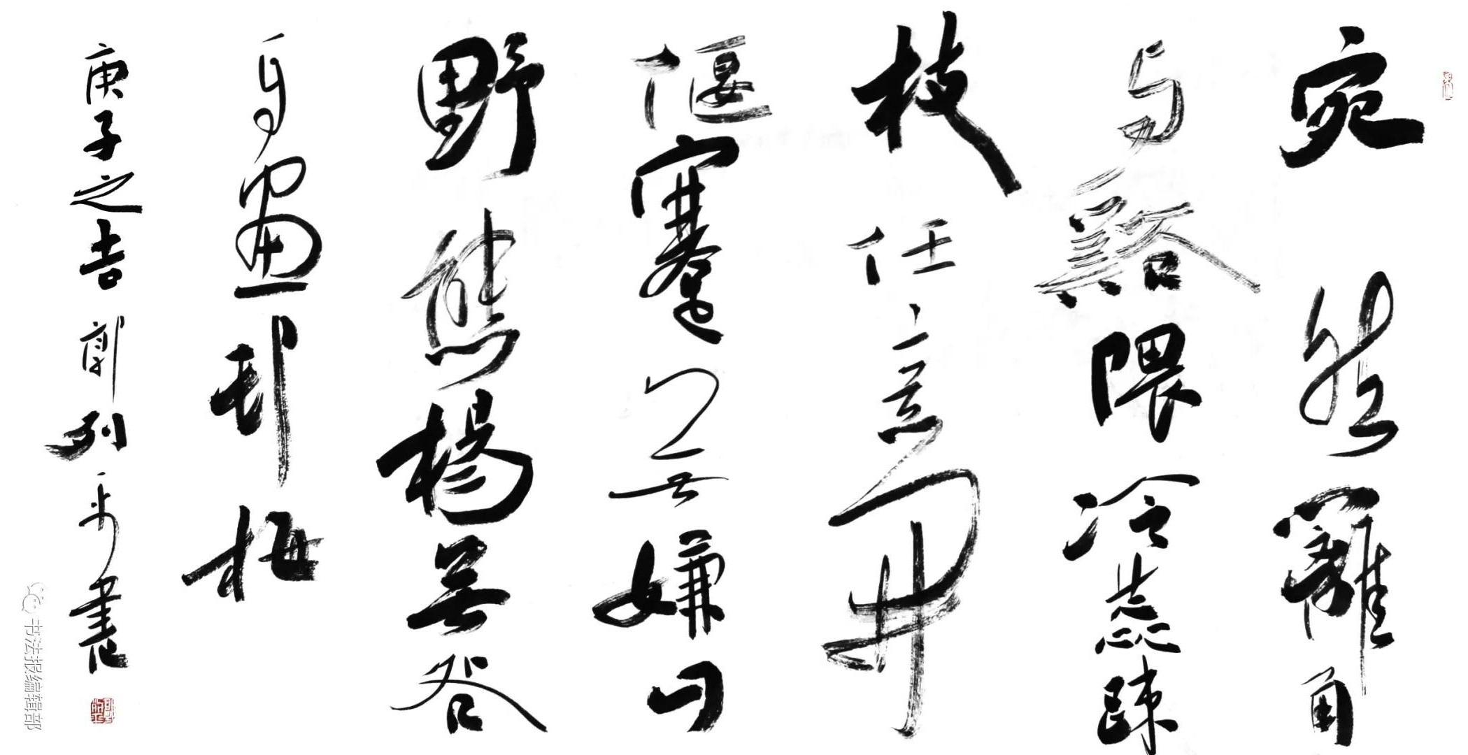行草扇面 画之逸格,最难其俦。拙规矩于方圆,鄙精研于綵绘,笔简形具,得之自然,莫可楷模,出于意表,故目之曰逸格耳。 大云覆宇 中含古春 ——郭列平书法艺术略说 冯剑星 李后主有论书句曰:“壮岁书亦壮,犹骠姚十八从军,初拥千骑,凭陵沙漠,而目无全虏;又如夏云奇峰,畏日烈景,纵横炎炎,不可向迩,其任势也如此。”李重光之论,甚能契合书理之妙处,若是壮年之书,不能风发鹰扬,鱼龙潜跃,终不能得变化二字之真谛也。书者,起于方正,行于温润,止于清凉,当是合乎变化之理。近见人作书,食古者多矣,化出者少矣,岂不知书法二字若不能从古人间化出,终不是自家面目,到死也是一抄书匠也。或谓:如何是壮年之书?对曰:壮年之书,当求厚,求拙,求雄浑,求空灵。譬如长江大河,譬如阵云千里,譬如海天月色,譬如云蒸霞蔚。 试以郭列平先生书法说之,养墨以灵,活笔以神,虚实相生,吐纳纷纭,大云覆宇,中含古春。其更是以厚积之法而涵养虚灵之气,修身之则以见俊逸之态。其笔底壮阔恣肆,纷披浑厚,一往无前,滔滔不竭。余所以谓郭列平先生之书是壮年之书,是称其厚拙。书何以谓之厚拙?必是积累而成也。郭列平之书法,由篆入草,由草入隶,更由隶入行,三者相互融通,使篆有草灵动之意,而不拘泥呆滞;草有隶高古之气,而不轻浮滑脱;隶有行清逸之味,而不僵硬板实,三者相互变通,相互印证,才见其书法精彩之处。遍及诸家,裁成一相,由是厚拙古淡,方是此大手笔也。 余所以谓郭列平先生之书是壮年之书,是称其虚集空灵。书何以谓之虚集空灵?庄子曰:“气也者,虚而待物者也。唯道集虚。虚者,心斋也。”凡书家作书,不能从大处着眼,小处着手,终不是大高手。以虚为道者,书作才有空灵之美,灵秀之气。郭列平书法是以雄肆之笔构造空灵之境界。其笔下大开大合之处,自是波澜壮阔,笔挟风雷,然行间中锋,飞白吐露,浓淡相宜之际,又见皓月千里、静影沉璧之景象,更使人叹为奇绝之处。蔡邕论书《九势》曰:“势来不可止,势去不可遏,唯笔软则奇怪生焉。”郭列平先生之书法,正合“来不可止,去不可遏”之诀,然其所构造之空灵精微之境界,当正是“奇怪生焉”。 郭列平先生书法能纵横捭阖之间援翰挥洒,容纳大千,观其书使人能于奔腾之际静止,浮躁之后落寞,此两者是相互矛盾之结合体,又是同时和谐存在之个体。当代书家之作品所稀缺者,绝非熙熙攘攘、光怪陆离之展览体,而是使人观后,给人以狂热后冷静之思考,此类思考,当于郭列平先生笔下见之。李后主论老年之书曰:“如诸葛董戎,朱睿接敌,举板舆自随,以白羽麾军,不见其风骨,而毫素相适,笔无全锋。”郭列平先生之书作,正是于喧嚣之后,认真冷静思考所创新之创造。不薄于己,不媚于人,自抒胸臆,臻于慎独。其将大巧不工之力量,化作举重若轻之境界。由重至轻之体现,由繁至简之转化,绝非一时偶然,当是由百炼钢成绕指柔,此种变化,亦是能者之言,智者之识,勇者之手段。