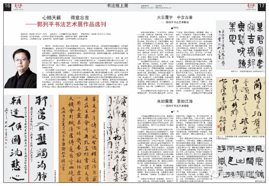 郭列平 国家一级美术师,江苏省书法院专职书法家。江苏省国风书画院副院长、江苏省侨界书画院副院长。曾先后就读于中央美院国画系书法专业、首都师大书法研究院、中国艺术研究院研究生院中国画写意人物专业。现为中国书协会员、中国标准草书学社社员、江苏省书协常务理事、江苏省青年书协副主席、江苏省政协委员、盐城市书法家协会主席、盐城市书画院院长、盐城市美术馆馆长、盐城市民盟副主委、盐城市政协常委、盐城市永宁书画院院长、盐城市侨联书画会会长。 2000年在中国美术馆举办书法展。先后被中国书协等授予“中国书法进万家活动先进个人”“送万‘福’进万家活动先进个人”“当代中青年书法十家”“首届江苏省优秀青年书法家”“江苏省德艺双馨中青年文艺工作者”“江苏省333工程”高层次人才培养对象、“江苏省五一劳动奖章”“盐城市有突出贡献中青年专家”“盐城市德艺双馨中青年文艺工作者”(荣立三等功)、盐城市道德模范提名奖等荣誉称号,获盐城市政府文艺最高奖盐渎文化新人奖和市政府文艺奖。 书法作品数十次获全国金奖,入展首届中国书法兰亭奖书法展,当代书坛名家工程——全国五百家精品展,第七、八届全国书法篆刻展,全国第七、八届中青年书法篆刻家作品展,第五届全国楹联书法展,首届大字书法艺术作品展,全国第二届行草书法展,全国第二届流行书风书法展,全国册页书法展,全国手卷书法展,全国第二届隶书书法展,当代实力派书法家作品展,中国近现代书画展,中国美术馆书法学术精品展等国家级展览百余次。 书法作品被北京故宫博物院、中国美术馆、中国文字博物馆等国内外几十个博物馆、美术馆及海外藏家收藏。中央电视台、北京电视台、上海东方卫视、南京电视台等数十家电视台以及《人民日报》《中国书法》《书法》《书法报》《美术报》《书法导报》等国内外近300种刊物曾专版、专题介绍其书法艺术。在国家中文核心期刊《瞭望》《艺术百家》《书法》等杂志发表学术论文10余篇。北京荣宝斋出版社等出版郭列平个人书法专集近20部。