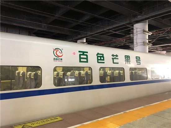 高铁动车“百色芒果号” 第一,在地理和资源优势方面。百色右江河谷是中国四大干热谷之一,右江河谷地势呈南北高,中间低,自西北向东南倾斜,北部以土山为主,南部以石山为主;而这里的土壤呈土母质,为第四纪红土发育而成的赤红壤、砂壤土、黄壤土,土层深厚、肥沃、耕性好;加上右江河谷属南亚热带季风气候区,冬春少雨,春季回暖快,非常适合芒果生产。 第二,在种植历史和渊源方面。百色右江河谷已有数百年的芒果种植历史,为变资源优势为经济优势,1985年,百色把种植芒果作为振兴百色经济,加快老区人民脱贫致富的一项支柱产业来抓。1993年4月,有关领导首先提出“右江河谷要将芒果发展到100万亩以上,力争建成全国最大的芒果生产基地”的战略性构思。经过近30年来的发展,百色市芒果产业获得了长足发展,芒果品种日益多样化,生产的规模化、集约化、标准化、品牌化水平不断提高,已经成为全国最大的芒果生产基地。到2019年底,百色芒果总面积达132万亩,其中投产面积86万亩,产量76万吨,产值41.31亿元,其中种植面积超过10万亩的品种有台农一号、桂热82号(桂七)、金煌芒和桂热10号等四大品种。另外,根据相关部门的初步预测显示:同期全国芒果种植面积约480万亩,产量约260万吨,百色芒果面积和产量分别占同期全国总量的27%和29%。百色芒果产业成为了实现百色市农民收入倍增的重要支柱产业。 第三,在品种研发方面。百色在大力发展芒果种植的同时,还加大技术研发力度,做好芒果生产技术研究,产区技术培训、技术示范与推广、技术服务和生产指导工作,2016年1月3日百色市成立了百色芒果研究院,这是全区唯一一个以单个作物品种生产服务的科研机构。为充实百色芒果研究院科研实力,百色芒果研究院外聘包括中国热带农业科学院热带作物品种资源研究所所长、农业部公益性行业科技芒果专项首席专家陈业渊等6名芒果专家作为百色芒果研究院第一批外聘专家,参与全市芒果产业的研究。百色芒果研究团队的组建有利于加强对新品种选育以及栽培、采后商品化处理、保鲜贮运、加工等新技术的开发,为百色芒果产业发展提供可靠的技术支撑。为优化百色芒果品种品质,百色不断探索和研究适应当地气候和土壤特性的优良品种。通过新特品种和高效种植的引进示范,筛选出适合本地种植的特色品种和先进栽培管理模式,积极宣传、培训、推广,形成众多的地方特色产品和地方品牌产品。目前百色主要栽培的芒果品种有:台农1号芒、桂热芒82号(桂七芒)、金煌芒、桂热芒10号、红象牙芒、贵妃芒、热农一号芒等。目前统计有30多个品种在我市种植,其中,早熟品种为台农1号芒、贵妃芒等,在6月中下旬上市;中熟品种为金煌芒、红象牙芒、桂热芒82号、新世纪芒等,在7月上中旬到8月中旬之间上市;晚熟品种为桂热芒10号、凯特芒等,在8月中旬之后上市。