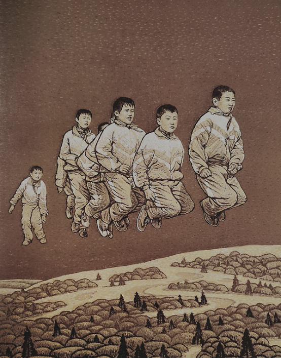 《新居》 《旷野的层林》、《远山掠过》、《驼鹿谷》、《梦回额尔古纳河》、《春归南瓮河》、《暮归》等作品,明显有一种回归、寻根的意向,他要追索生活赐于他最初的印痕,扑捉人生的灿烂记忆。《春光》中几个孩子跳绳的瞬间,动作协调,腾空跃起,目视远方。这幅画的构图非同一般,把画中的主人安排在一个虚幻的空间,从视觉上告知人们,他们不仅超越了脚下的土地,同时也置身于无限的时空之中。令人感到那里的孩子也有五彩斑斓的童年生活。有朝气,有梦想,同样享受了人生启蒙阶段的一缕春光。