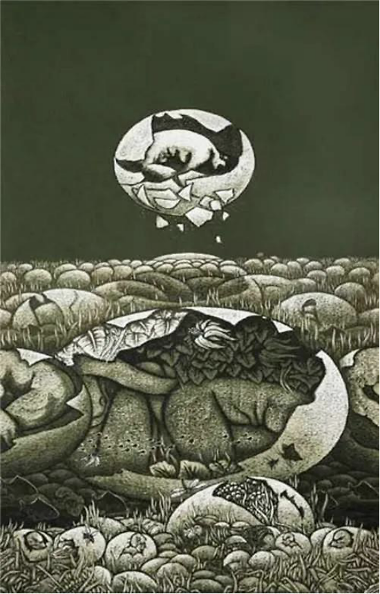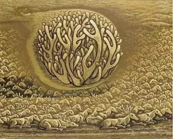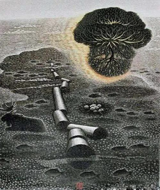 《夜.昼.之二》 《这山·那山》、《远山故事》组画,《飘逝的萨满》等作品,是他与鄂伦春人曾有一年多相处的生活库存的再现,尤其是《这山·那山》,将人们引向游牧民族从远古走来的岁月流痕,只因为作者也有走过山山岭岭的多种体验,才有这种直奔史诗文化蕴涵的切入。《记忆的河流》、《归来的家园》组画,是对自然生态环境遭到破坏,呼唤绿色世界的呐喊,那已变成干涸的碎石,远处的浓烟火海将要吞噬一切,失去家园的驯鹿,腾空飞驰,迷惘、祈盼、何往?