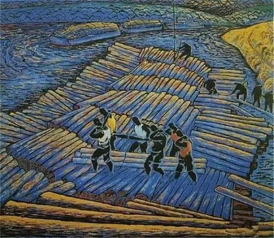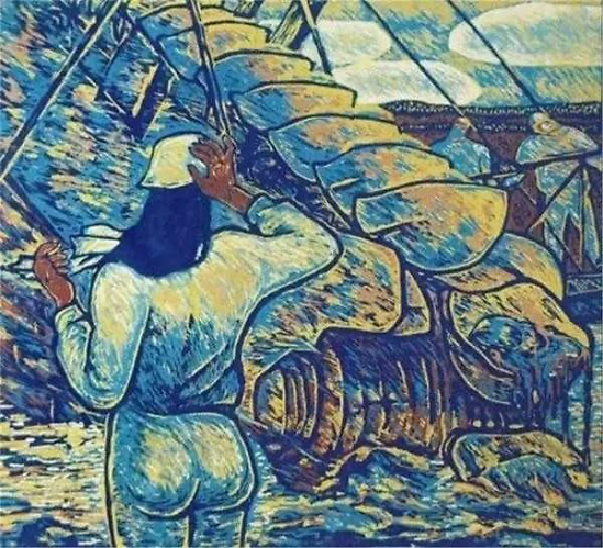 《船之吟潮之咏》 和那个时代的绝大多数艺术青年一样,徐成春早期的作品有着十分强烈的时代感。1979年至1992年,他的作品主要反映他所熟悉的、大兴安岭一带的生活、工作场景。带着亦步亦趋学习老师的痕迹、带着年轻人的浪漫、带着时代赋予的那种激情,他的《胭脂沟之春》、《源头的号子》等,“木味”浓厚、“刀味”十足,“刻味”充沛,同时“革命精神干劲高涨”。隔着几十年的时光回望,有些稚拙,也有些刻板,但那种年轻的、澎湃的气息依然像黑龙江的江水在奔涌。