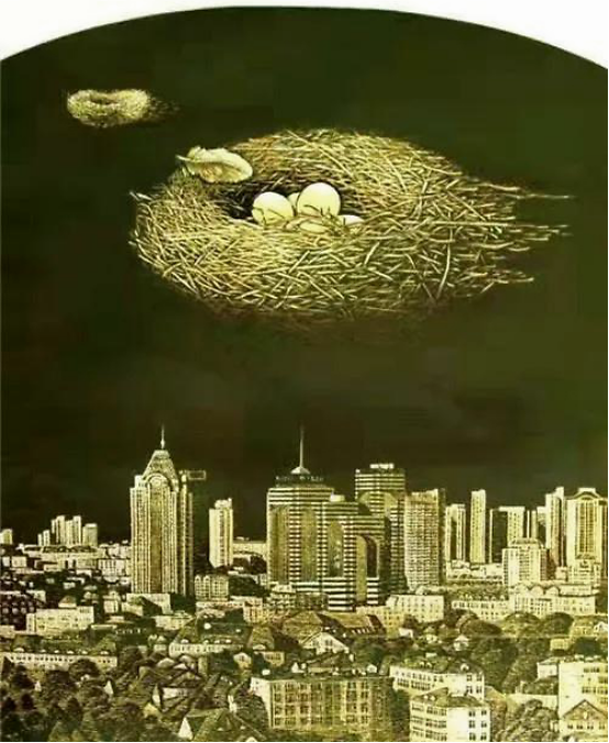 《再生》 徐成春的前期作品,缘自对现实生活的审美关照和体悟,倾向“自然”而非“人工”,是“原野”、“原材料”、“原创”、“原动力”,带给人们心灵的冲击。不论是生活还是情感,只要是初衷,是真,是善,是美,都像金子一样永远会发光。他的近期作品,是在审美体验基础上的升华,画境中洋溢着感性体察与理性的思考,人生体验与现实的关注,看得出他在进行对生活体验的梳理,人生境界的聚焦,艺术追求的定向的流程中,求新求变。