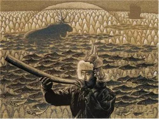 《问天》 令我迷惑的是徐成春而后却又没有继续创作更多抽象主义的新作。(当然也许是我没有看到他全部作品才这么说。)一般的艺术家走向抽象主义风格后,就很难再回头了。因为一旦他脱离开具象对人的制约,自由感会像风一样鼓舞着他想要无拘无束地飞。可徐成春却在2008年前后推出了《鹿笛》、《飘逝的萨满》、《远冬》、《春光》等一系列介乎于写实和写意之间的作品。——我想这个人一定是个习惯思考的人。他在具象与抽象之间摆荡。他在不断思考着现代性和原生态的表现手法。而且,大约是他生活中出现了什么特别打动他心灵的事情?他洋溢出很多很多的感情和深情。