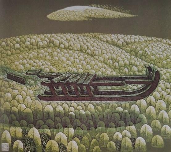 《遗失的层林》 可是,这个出身贫寒的子弟,若一直沿着这个路子走下去,他也就“出不来了”,为什么?太僵了,太写实了,也太“黑龙江版画”了。——那个时候,由北大荒版画、阿城版画、大庆版画、大兴安岭版画、鸡西版画组成的黑龙江版画,在黑龙江文化发展史上占据了重要的地位。他们的作品以北大荒的自然风光和下乡知青的劳作与生活为主,改变了我国木刻以黑白为主要色彩的艺术表现手法,更多地使用色彩作为主要的造型手段,增强了套色版画的艺术感染力,开创了我国现代创作版画风格流派的新格局,但整体过于现实主义的风格和过于保守的格调,使他们在“八五新潮”带来的撞击中很快跌入了低谷。