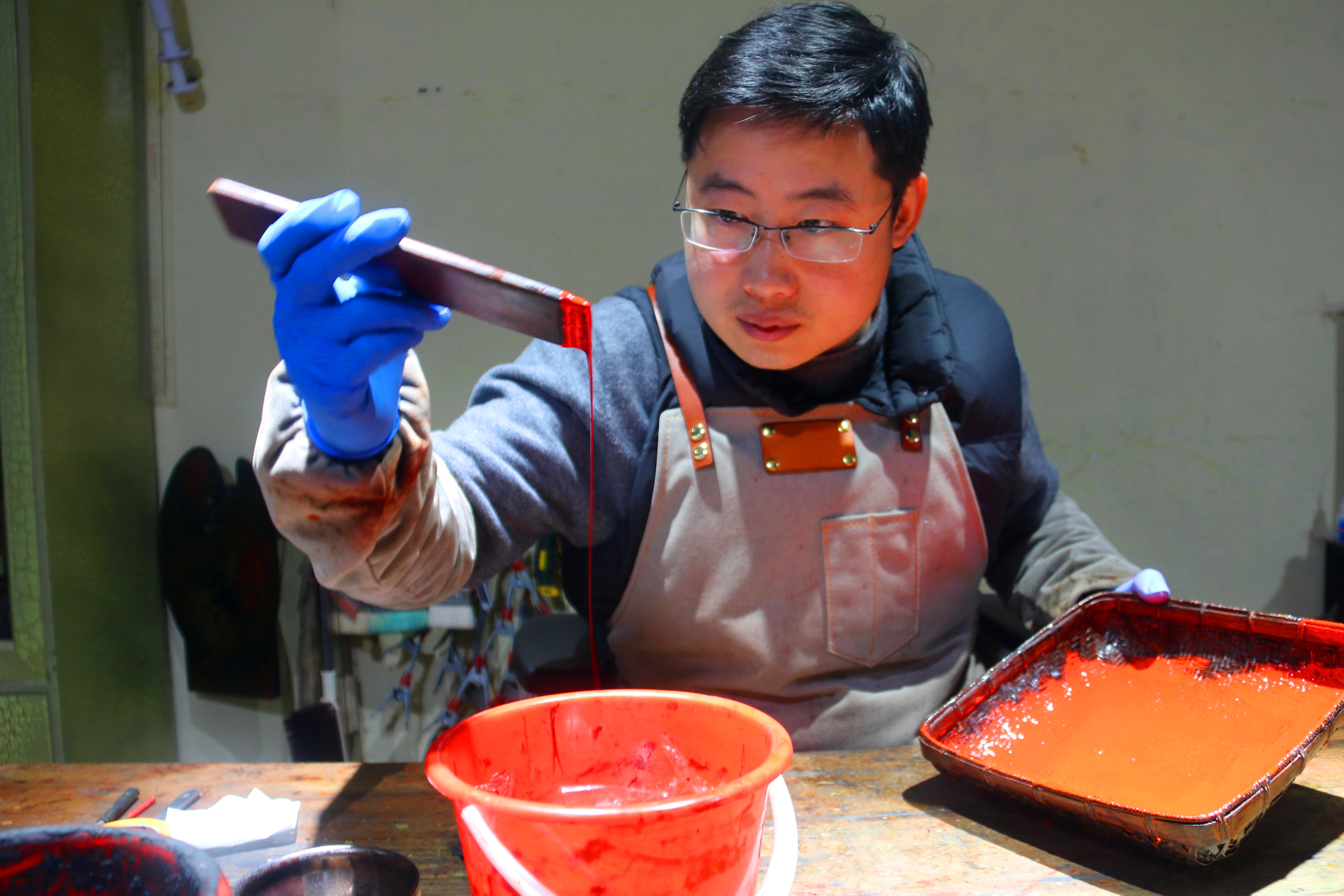 钟奇君的父亲钟宏云是传统大漆髹饰漆艺家,在耳濡目染中,钟奇君从小就对漆艺感兴趣。18岁时,他正式跟着父亲开始做漆艺。偶然中,钟奇君从一本日本漆艺书籍上了解到金缮工艺。书中的一件金缮展品,从视觉上带给他极大的震撼:一个原本破损的瓷器,可以如涅槃般获得重生,修复得如此精美。但是,这一起源于中国、发展于日本的修复技艺,在国外许多博物馆里都可以看到其身影,偏偏国内却对它知之甚少。金缮是中国古代漆艺的延续,也是文物修复的一个分支 。钟奇君暗下决心,一定要学好这门工艺,并发扬传承下去。 因为有漆艺基础,钟奇君的金缮之路比别人顺很多。钟奇君说,初学者刚接触大漆时,容易引起过敏症状,但也许他从小生活在有大漆的环境中,从未有过过敏的症状,很快就上手了。有句流传的行话是这么说的,大漆从来不‘咬’传承人。由于温湿度难控等因素,要把金缮工艺学精很难。钟奇君每天6时许起床,在工作室日复一日地进行繁杂的修补工作,通常要干到半夜才休息。从18岁到34岁,16年过去,钟奇君从摔坏新器皿练手,到拿着战国时期的陶器也淡定修复。凭借用“匠心”做事的性子,钟奇君每天进行着漫长而繁复的修补工作,很快成为一名职业金缮师,走上了与父亲不同的漆艺之路。“至今修复了多少器物,具体的数字已经没有办法考证,但每个月都有几十件,应该有上千件了吧!”钟奇君说。