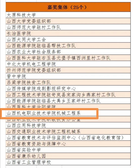 日前,根据省人社厅《关于在全省事业单位集中开展脱贫攻坚专项奖励工作的通知》精神,在教育厅组织开展的推荐评选工作中,山西机电职业技术学院机械工程系被评为脱贫攻坚专项奖励嘉奖集体。