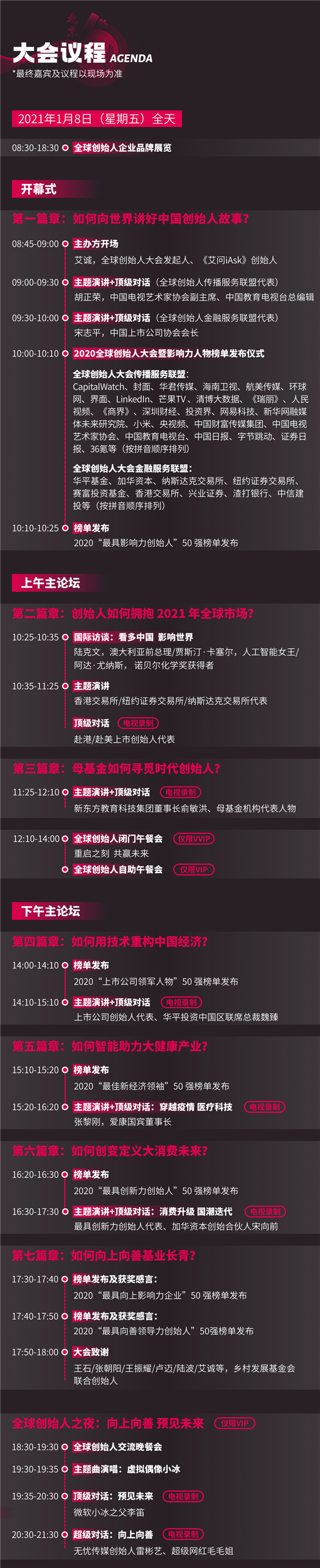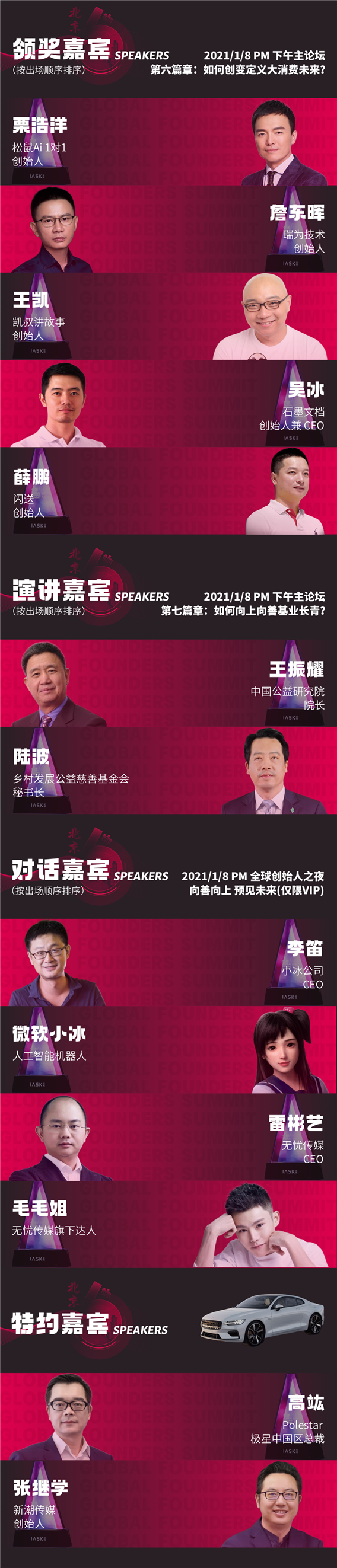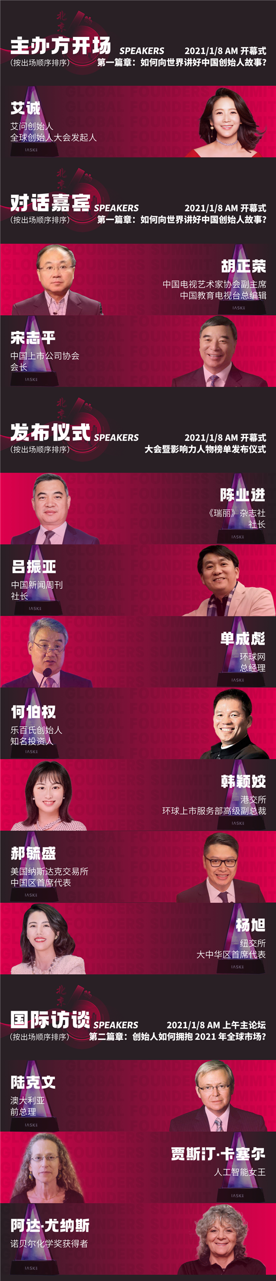 一、2020全球创始人大会是什么? “2020全球创始人大会暨影响力人物颁奖典礼”将于2021年1月8日在北京举办。本次大会由《艾问人物》发起,携手「全球创始人传播服务联盟」及「全球创始人金融服务联盟」主办。本次大会将邀请知名投资人、全球创始人等数百位顶级嘉宾,以“预见未来 向上向善”为主题,共商价值创新,共瞻未来趋势。 ![]() 本次大会将以“开幕式+主题演讲+顶级对话+榜单发布+闭门对接会”为形式的人物颁奖典礼。 目前,2020全球创始人大会组委会已与「全球创始人金融服务联盟」、「全球创始人传播服务联盟」评选确定,拟发布六大榜单,邀请300位时代创始人及代表到场。其中包含最具影响力创始人50强、上市公司领军人物50强、最佳新经济领袖50强、最具创新力创始人50强、最具向善领导力创始人50强、最具向上影响力企业50强。 此外,本次大会还特设七大主题篇章: 第一篇章:如何向世界讲好中国创始人故事? 第二篇章:创始人如何拥抱2021年全球市场? 第三篇章:母基金如何寻觅时代创始人? 第四篇章:如何用技术重构中国经济? 第五篇章:如何智能助力大健康产业? 第六篇章:如何创变定义大消费未来? 第七篇章:如何向上向善基业长青? ![]() “闭门对接会”环节,与会创始人们会有「全球创始人金融服务联盟」和「全球创始人传播服务联盟」代表与您互动,其中「全球创始人金融服务联盟」可以参与辅佐创始人完成公司从天使到上市各个阶段的投融资管,「全球创始人传播服务联盟」则可以与创始人共同向世界讲好中国创始人的故事。 ![]() 本次2020全球创始人大会,艾问传媒联合渣打银行为百位创始人准备了以“重启之刻 共赢未来”为主题的精致午餐会。下午场,还邀请当红AI偶像微软小冰,进行精彩的虚拟偶像演唱会表演,以及还特邀超级网红毛毛姐前来助阵。此外,艾问还为创始人们准备了以“向上向善 预见未来”为主题的“全球创始人之夜”,共同洽谈商机并一同预见未来,给大会带来不同寻常的创始人大会体验。 四、2020全球创始人大会什么大佬? 本次大会还特邀以下重量级嘉宾:中国电视艺术家协会副主席、中国教育电视台总编辑胡正荣莅临现场,助力《艾问人物》引领创新创业教育、中国上市公司协会会长宋志平支持《艾问人物》助力新经济正能量、华平投资中国区联席总裁魏臻,共同探讨如何用技术重构中国经济?与爱康国宾董事长张黎刚探讨智能助力大健康产业以及特邀加华资本创始合伙人宋向前共同讨论消费升级、国潮迭代等话题。大会还将有百位上榜人物嘉宾代表及创业者参与其中,解读宏观经济、引领公益初心、讲述创业未来。 ![]() ![]() ![]() 2014年至今,参与顶级对话时代创始人、投资人超过数百位,《艾问人物》连续6年记录时代人物近2000位,镜头下的他们共同与艾问预见未来: 吉利集团创始人李书福:预见未来,我相信世界更美好。 西贝餐饮集团创始人贾国龙:预见未来,我相信百术不如一诚。 行云集团创始人王维:预见未来,我相信一切皆可计算。 小鹏汽车创始人何小鹏:预见未来,我相信美好的事情就从你自己开始。 洛可可创始人贾伟:预见未来,眼中有光、心中有梦、脚下有力。 老乡鸡创始人束从轩:预见未来,做中国人的家庭厨房。 加华资本创始人宋向前:预见未来,我相信中国消费的力量。 蔚来汽车创始人李斌:选择相信美好的事情是一种能力,更是一种勇气。 ![]() 六、2020全球创始人大会什么感动? 如何向善? 在这期间,有那样一些创始人和他们所带领的企业,捐款捐物奉献爱心。艾问传媒联合中国公益研究院,旨在寻找那些在各自领域普遍拥有广泛的影响力,并愿意用他们的影响力去践行公益的创始人、公益人。 如何向上? 创始人群体正在经历由一个人的向善驱动一个组织的向上,艾问旨在寻找这个时代的向善人物、寻觅这个时代的向上企业,我们将于2021年1月8日在北京为获奖的向善人物与向上企业举行盛大的颁奖典礼。 七、2020全球创始人大会什么商业? 什么创新? 大会现场,你会接触到全球最时尚的装修品牌,简一大理石;体验最新的AI识别技术,瑞为技术;聆听虚拟偶像演唱会,微软小冰;品尝到以水之名、不忘初心的VOSS水;智能服务让创业更健康,爱康国宾;相信科技后浪,开山白酒;数字化开启梯媒新时代,新潮传媒;北欧极致、极星创造,polestar汽车;梦想加速,滴滴豪车。 此次大会将有超过100家媒体到场,权威媒体专场演播室、大会现场直播等全方位的媒体互动,参与本次大会的创始人还将有机会登录小米电视“人物频道”、闪耀华君传媒机场大屏、覆盖新潮楼宇电梯媒体大屏、触达全国高端餐厅小热点屏幕,畅享央视频直播、新浪直播、百家号直播、一直播、大佬微直播,上线中国教育电视台、中国日报、环球网等权威媒体,登录海外Instagram、YouTube。 |