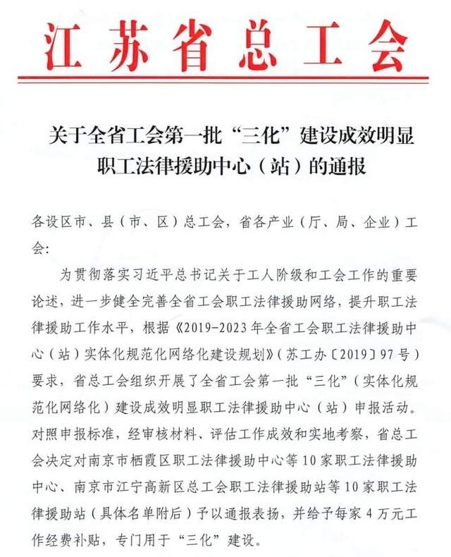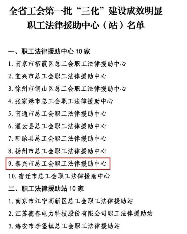 喜大普奔! 江苏省泰兴市总工会法律援助中心叕出名啦!全省称号!厉害了! 12月8日江苏省总工会专门发文通报表扬全省工会第一批“三化”建设成效明显的职工法律援助中心(站)江苏省泰兴市总工会法律援助中心榜上有名!