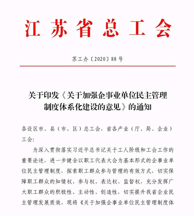 每年至少召开一次职代会依法建立职工董事、职工监事制度广泛开展协商民主、听取职工意见……为实现民主管理工作更高质量、更有效率,切实保障职工群众的知情权、参与权、表达权、监督权,日前,江苏省总工会就加强企事业单位民主管理制度体系化建设专门发文。