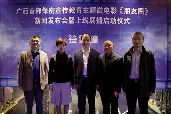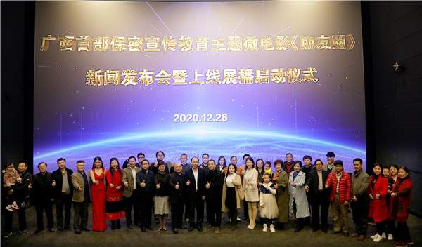 12月26日,由广西壮族自治区国家保密局、广西红水河文化旅游开发有限公司、广西电视台《绿色广西》栏目联合摄制的保密宣传教育微电影《朋友圈》新闻发布会暨上线展播启动仪式在南宁举行。 自治区国家保密局局长谢德元、自治区国家保密局副局长谭小燕、自治区国家保密局总工程师韦灿明、自治区国家保密局相关处室领导,广西电视节目交流供片中心主任宁波,广西三月三杂志社总编覃祥周,微电影《朋友圈》导演王杰清、编剧彭三卷、监制罗建文、主演邱昱翔、王裕华等领导嘉宾、主创人员及媒体记者共100多人出席此次新闻发布会。