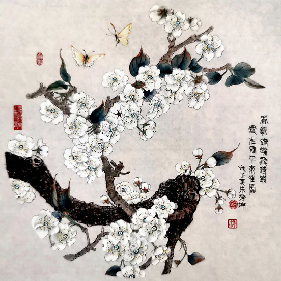 名家点评朱秀坤先生画作 蒋采苹(中央美院教授、中国工笔画学会常务副会长) 朱秀坤的画,工整精到,特别是传统技法的运用熟而能化。如《白梅山雀图》画面空间“留白”、枝干穿插、肌理的处理恰到好处。 牛克诚(中国艺术研究院研究员、著名画家、美术评论家) 朱秀坤的工笔画工细雅致,当属北方画派,可谓之得到俞致贞先生画艺的真传;又吸收了陈之佛南方画派的精华,又谓之南北画风的融合。