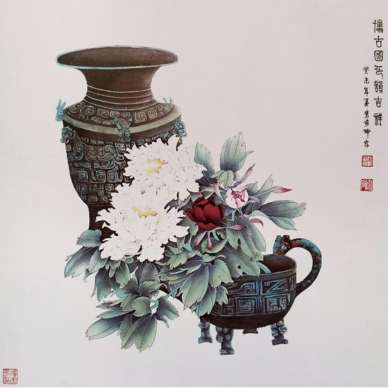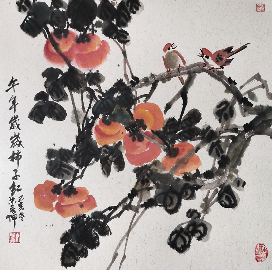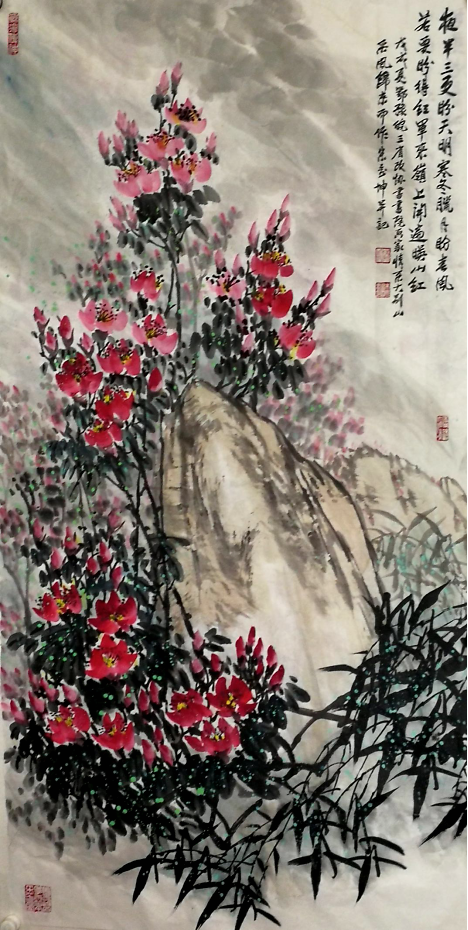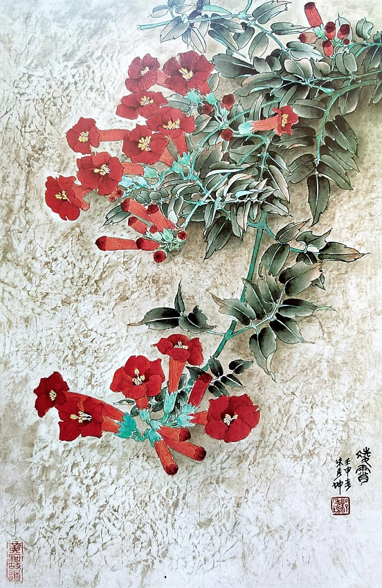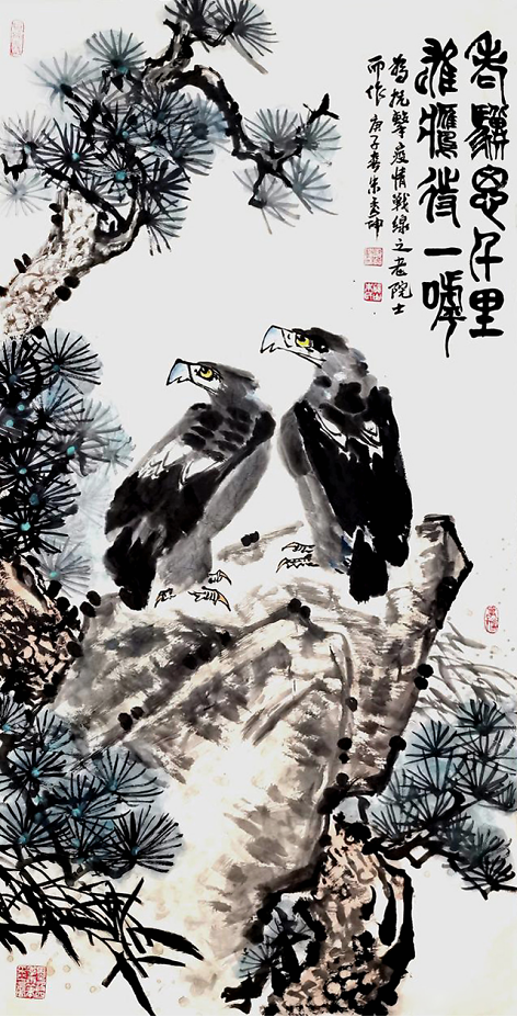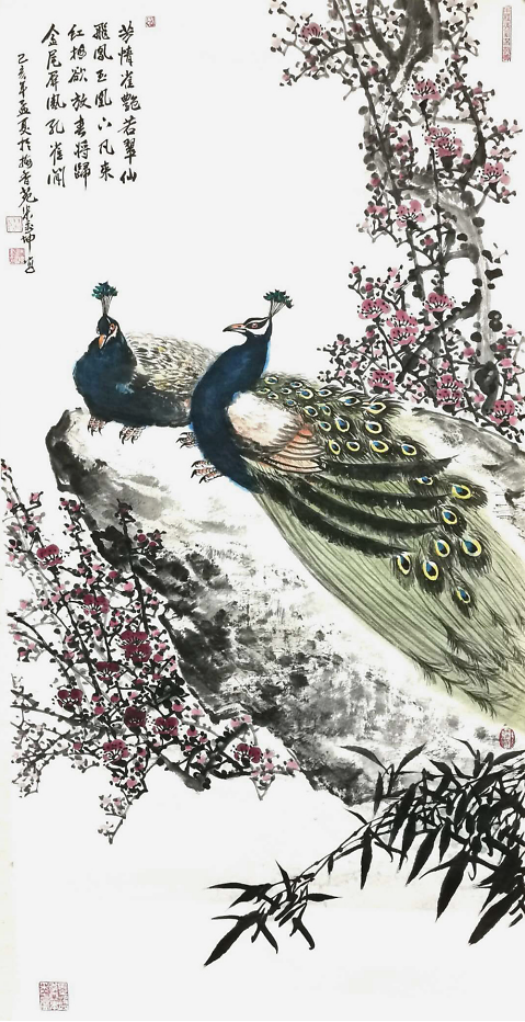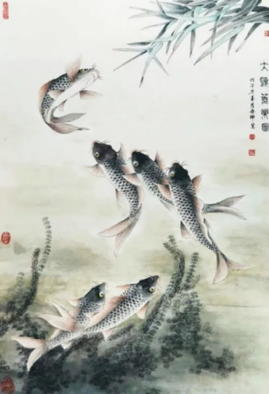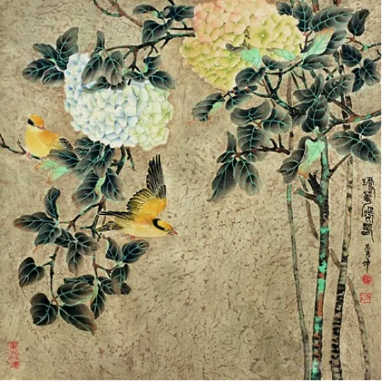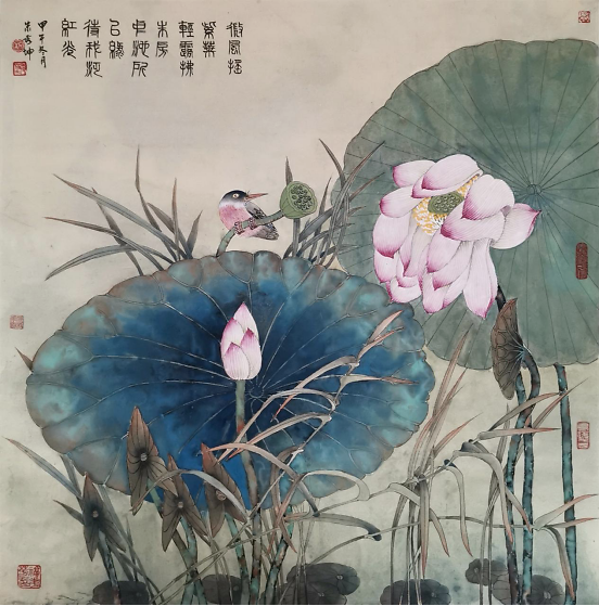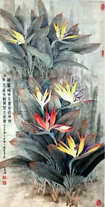虽然他描绘的是人们常见的牡丹、荷花、石榴、游鱼、蜻蜓、仙鹤,但是意境不同,给人一美景,给人以春光,给人以力量,“情绪饱和,构图新颖,色彩明艳风格多变,清新甜美,生气盎然”,达到了新的技法和风格。在他的作品中,不仅是工笔,他的写意鸟画得也很好。因为有扎实的工笔造型功底,画起“写意”来就得心应手了。能工能写,难能可贵也。