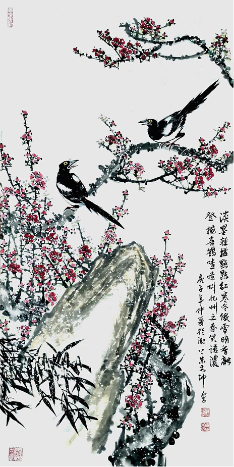朱秀坤先生的梅花作品确属“有思想、有品位、有境界”的“高格”。画梅手法简洁、凝练,用笔张驰自如。在“惜墨如金”和“泼墨如水”之间,其绘画技法和节奏的把握,已达到信手拈来、挥毫自如的地步。