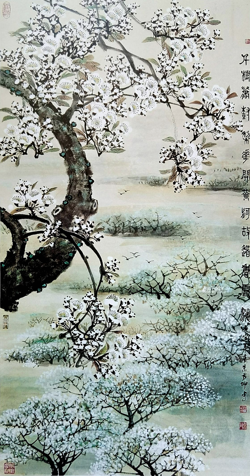 说到他的作品的雅俗共赏,使我想起最初的印象。朱秀坤先生出生于盛产梨子的砀山县,是淮北人。笔者十几年前认识他时,曾纳闷,一个北方的汉子,不知天天是如何耐得寂寞,一钩几染去画工笔画的。待到后来见到他更多作品后,才知道他在花鸟写意画创作上也是十分丰收。如他笔下的梅花,火热奔放,呈现粗犷的用笔性格。红梅,画得热烈;白梅如《散作乾坤万里春》,可谓是清气满乾坤,高洁气派。他笔下的荷花、水仙、游鱼、紫藤、葫芦等等,更是有手到擒来的洒脱,有文人画的雅致情趣。