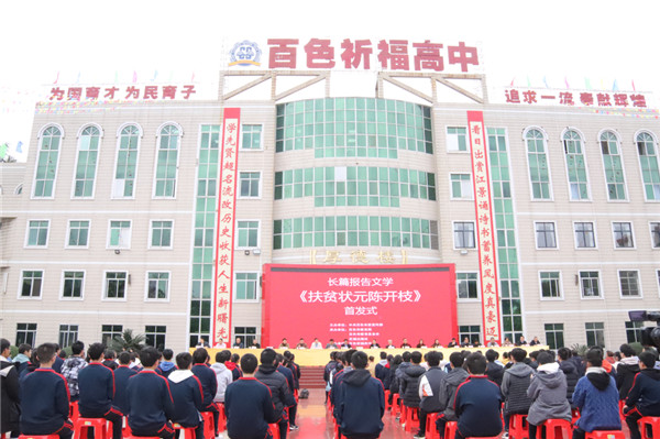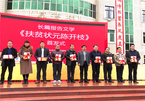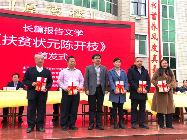 12月30日,由广东知名作家曾平标、廖琪撰写,花城出版的《扶贫状元陈开枝》首发仪式在百色举行。百色市教育基金会理事长梁文化,百色市教育基金会第一届理事会理事长石卫武,百色市人民政府副秘书长李正生, 百色市委宣传部副部长、市新闻出版局局长覃蔚峰,百色市人大副秘书长、办公室副主任黄文华,协作组处长莫丁汀等领导出席。百色市有关部委办局、学校,以及广东、广西主流媒体记者参加首发仪式。